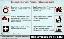 - Було зруйновано майже 700 українських міст і 28 тисяч сіл, вивезено 550 промислових підприємств, незліченну кількість історичних цінностей. Україна в результаті Другої світової війни зазнала матеріальних втрат у розмірі понад 45% від збитку усього СРСР.