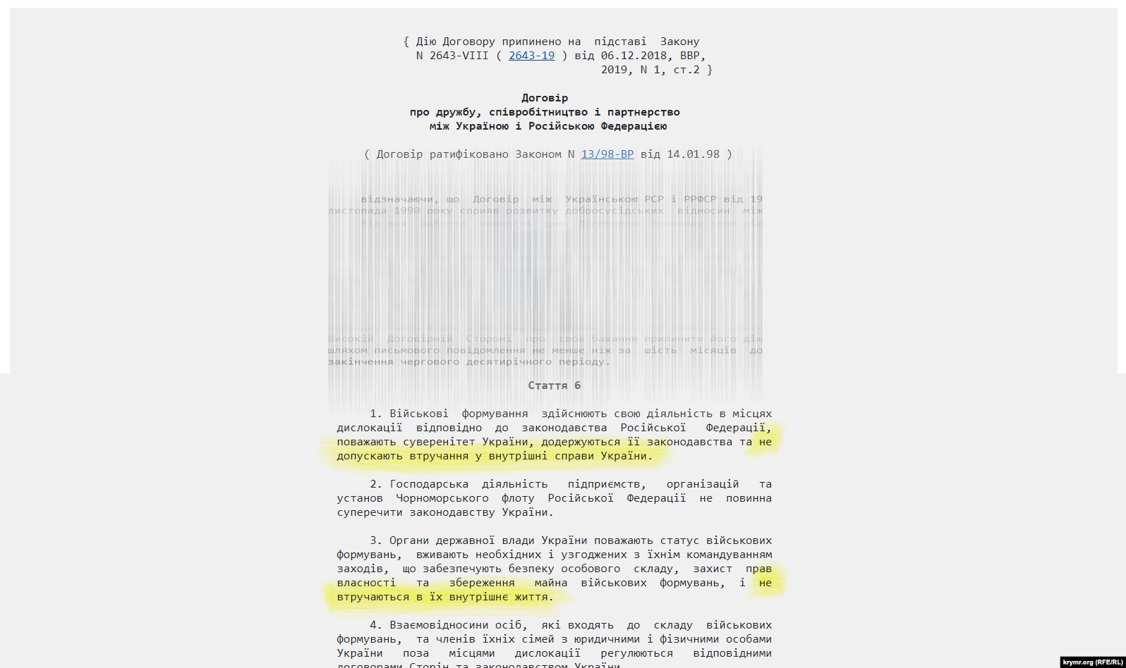 «У цьому документі було закріплено кількісний склад контингенту Російської Федерації. І він був обмежений тим поділом Чорноморського флоту, який стався напередодні. Договором передбачалося, що будь-яке нарощування об'єктів військового призначення, зброї зокрема, мало узгоджуватися з Україною», – роз’яснив телепроєкту Крим.Реалії Денис Кешкентій, віцепрезидент ГО «Колегія юристів з морського права України».