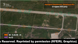 Російська армія з початком наступальної операції Збройних сил України на Запорізькому напрямку перекинула 20 військових гелікоптерів на аеродром у тимчасово окупованому Бердянську Запорізької області. Про це свідчать супутникові знімки Planet Labs за 13 червня, які є в розпорядженні проєкту Радіо Свобода «Схеми».