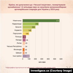 У лютому 2024 року Чехія обʼєднала навколо себе щонайменше 16 європейських країн-донорів та запустила незалежну від ЄС «Чеську ініціативу з постачання боєприпасів Україні». Коаліція взяла за мету закупити 800 тисяч снарядів переважно великих калібрів. Через рік після цієї обіцянки чеські посадовці заявили, що їм вдалося подвоїти цю кількість (українські урядові джерела називають обсяги помірнішими).